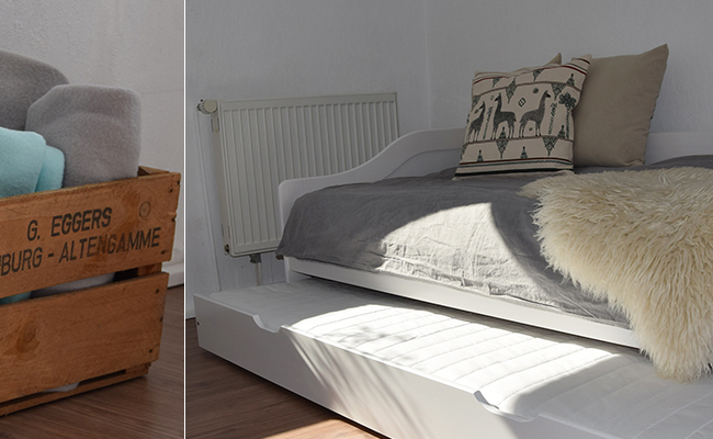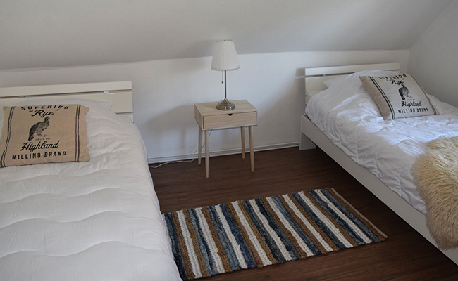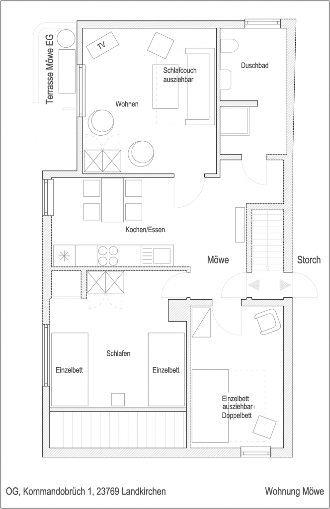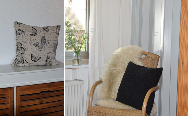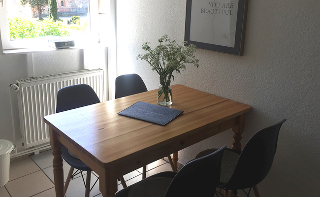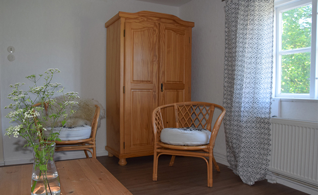 Komplett renovierte und modern eingerichtete Obergeschoß-Wohnung. Die Wohnung verfügt über 1 Schlafzimmer mit 2 Einzelbetten (Betten können zusammen stehen oder als 2 Einzelbetten auseinander geschoben werden), 1 Schlafzimmer mit 1 Tagesdoppelbett (einzeln oder zu zweit nutzbar/ausziehbar). Wohnzimmer mit Schlafcouch für 2 Personen. Küche komplett ausgestattet mit Kühlschrank, Spülmaschine, Mikrowelle, Herd/Backofen, Toaster, Tassimo Kaffeemaschine. Duschbad, großes Wohnzimmer mit Schlafcouch, TV, Radio.